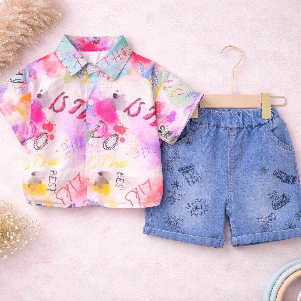 - printed shirt, denim Short