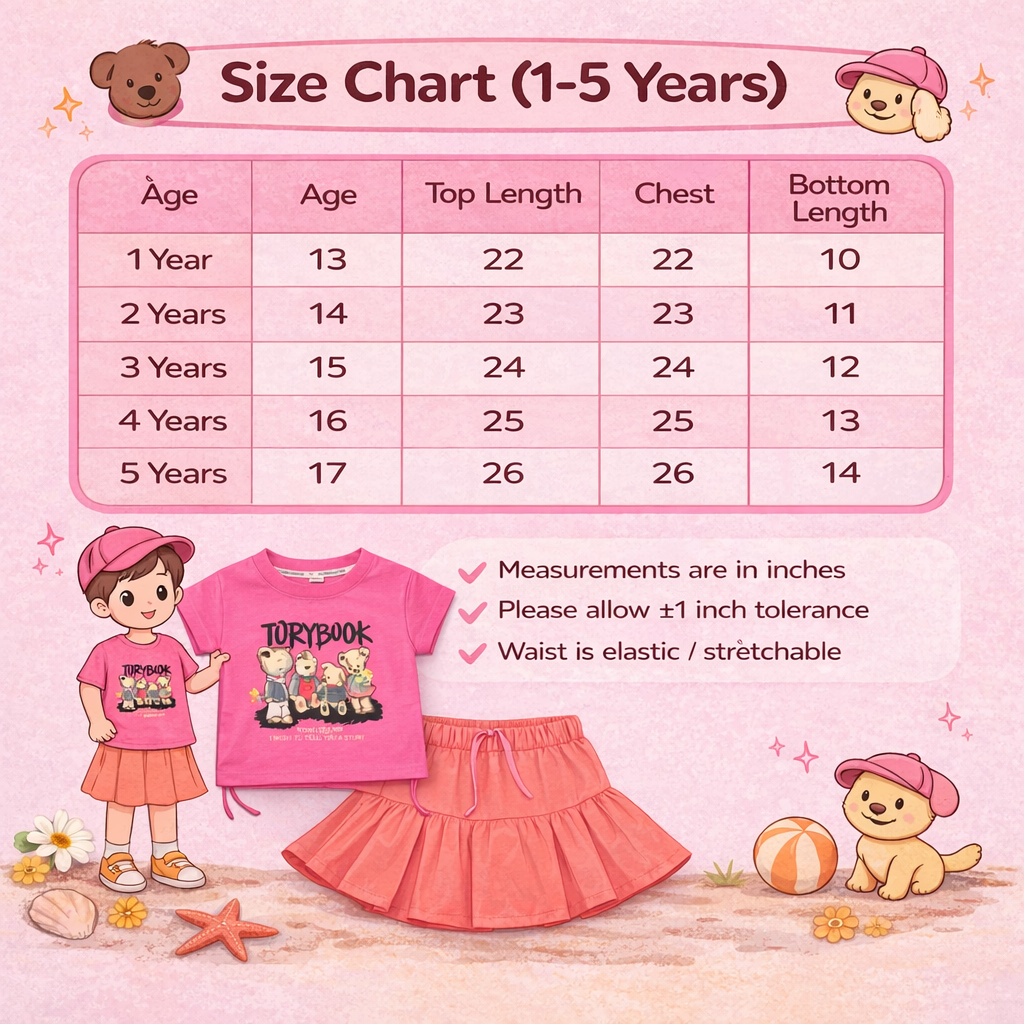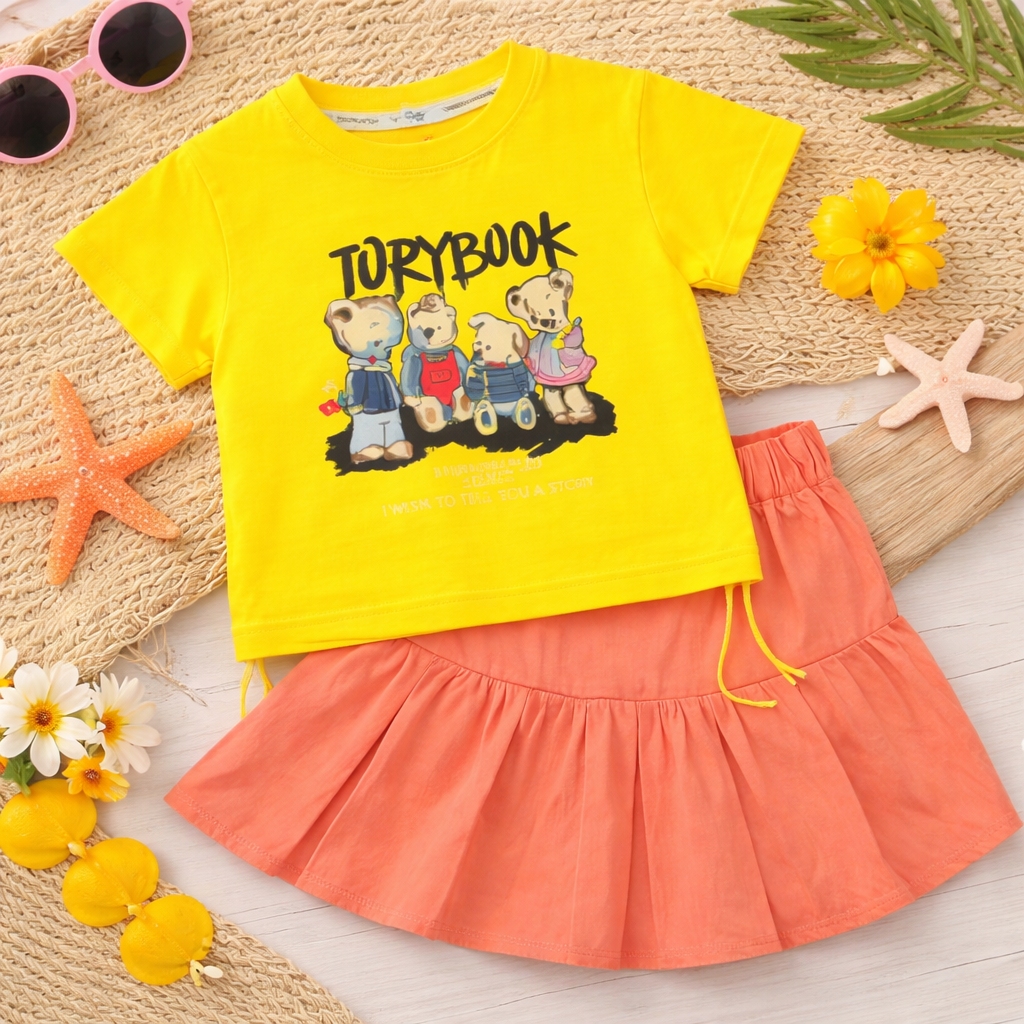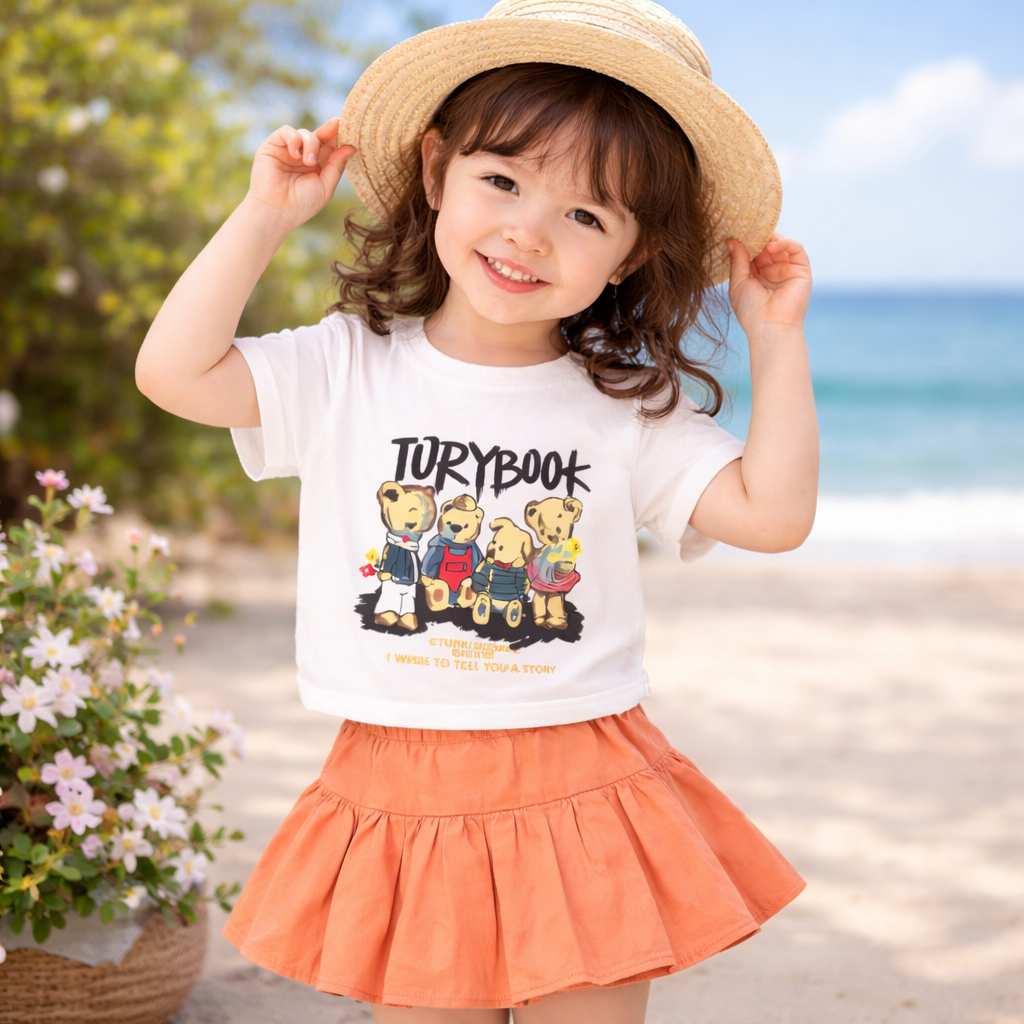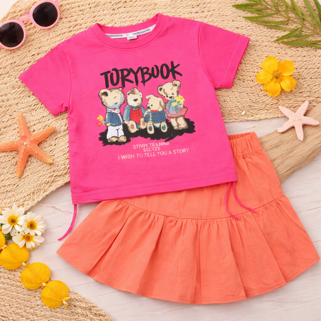 Kids Graphic Print T-shirt with Teddy Bear Design, Pleated Skirt Set