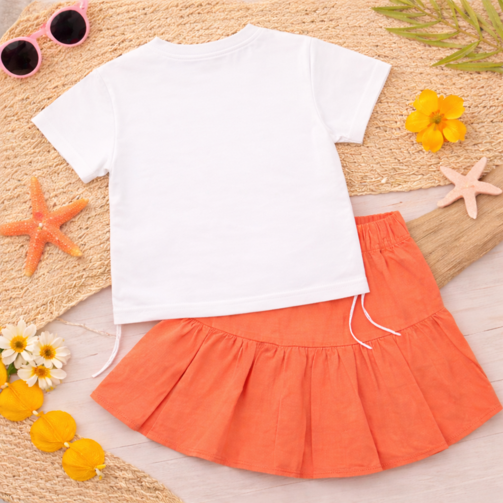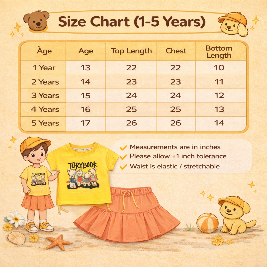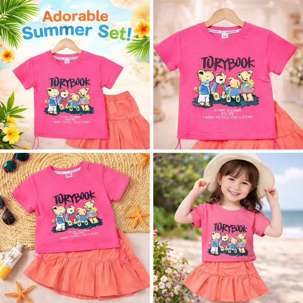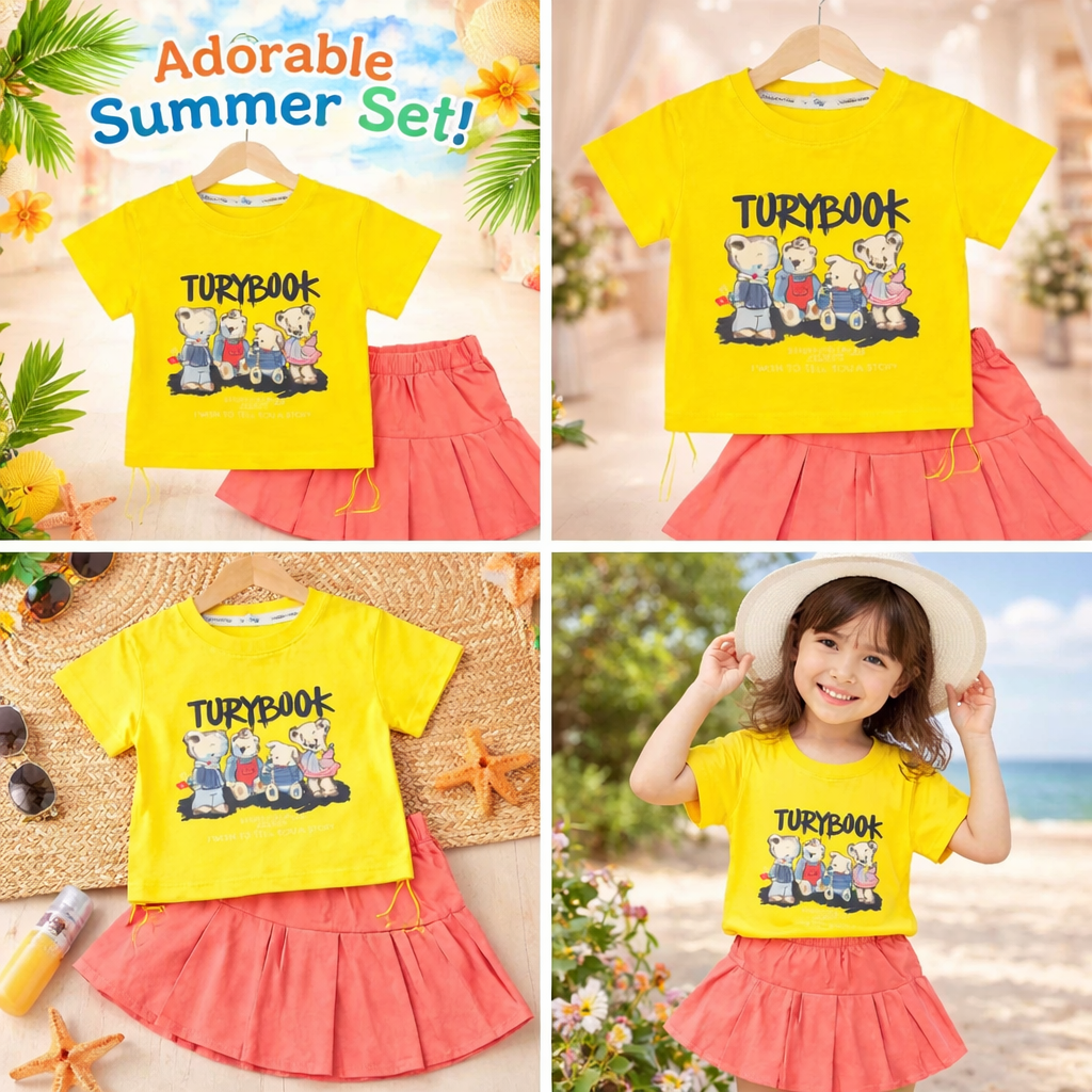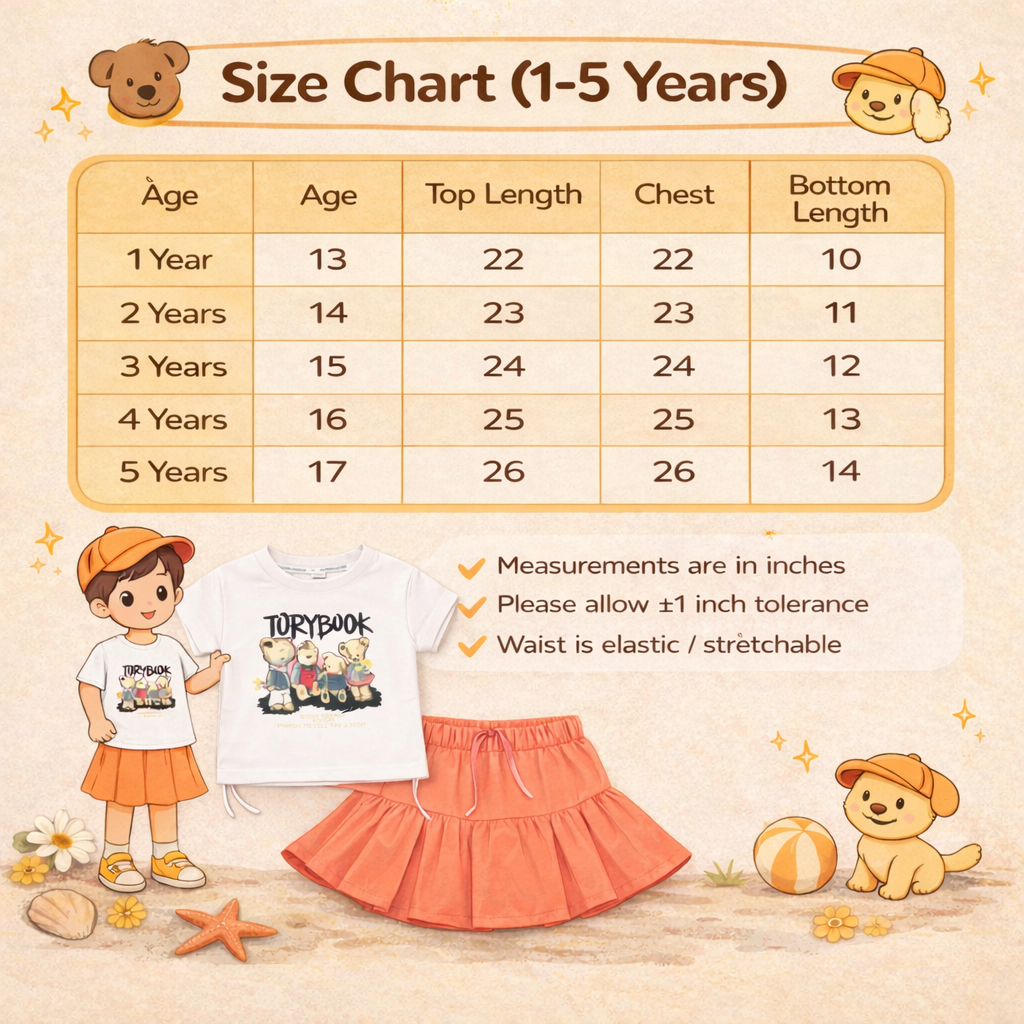 Kids Graphic Print T-shirt with Teddy Bear Design, Pleated Skirt Set