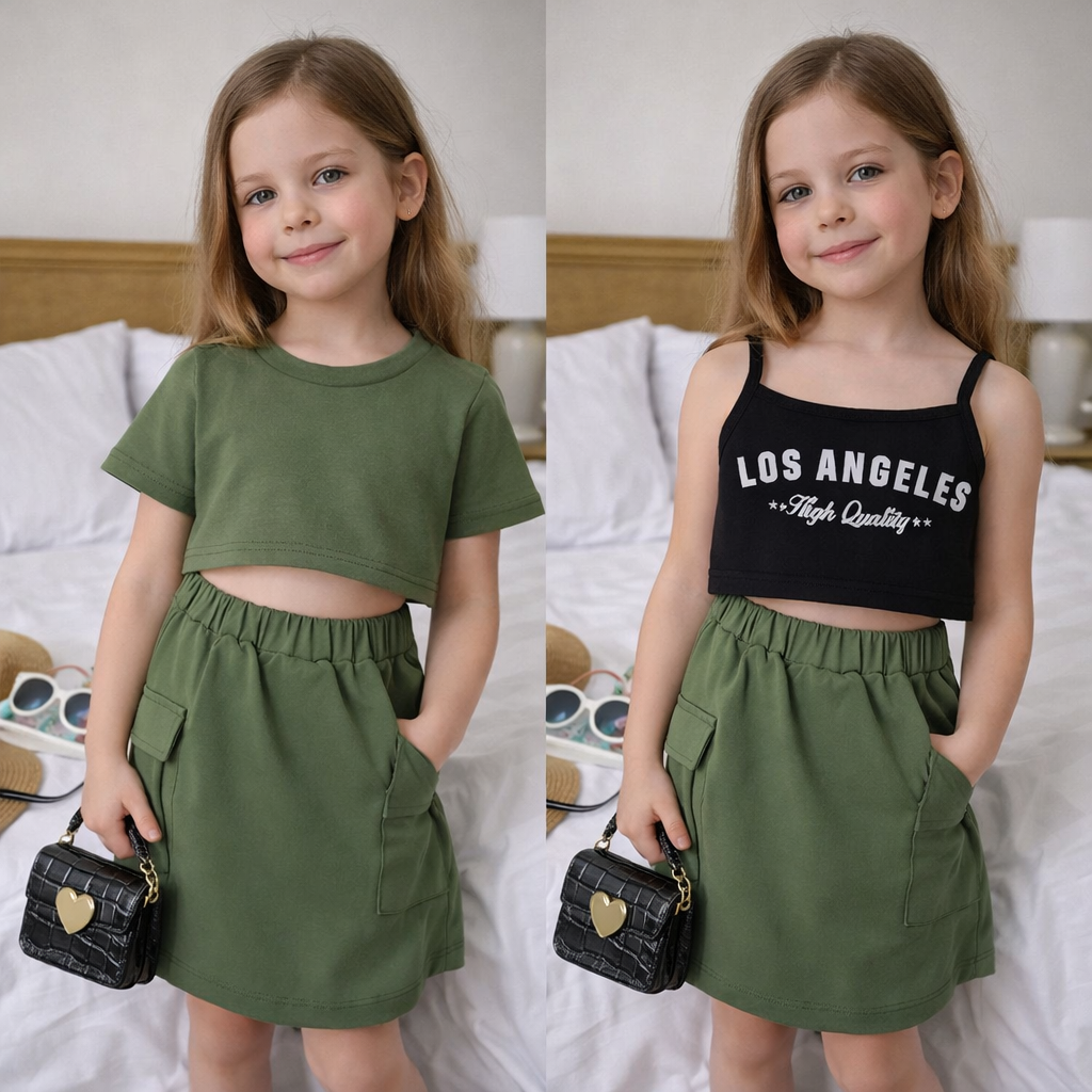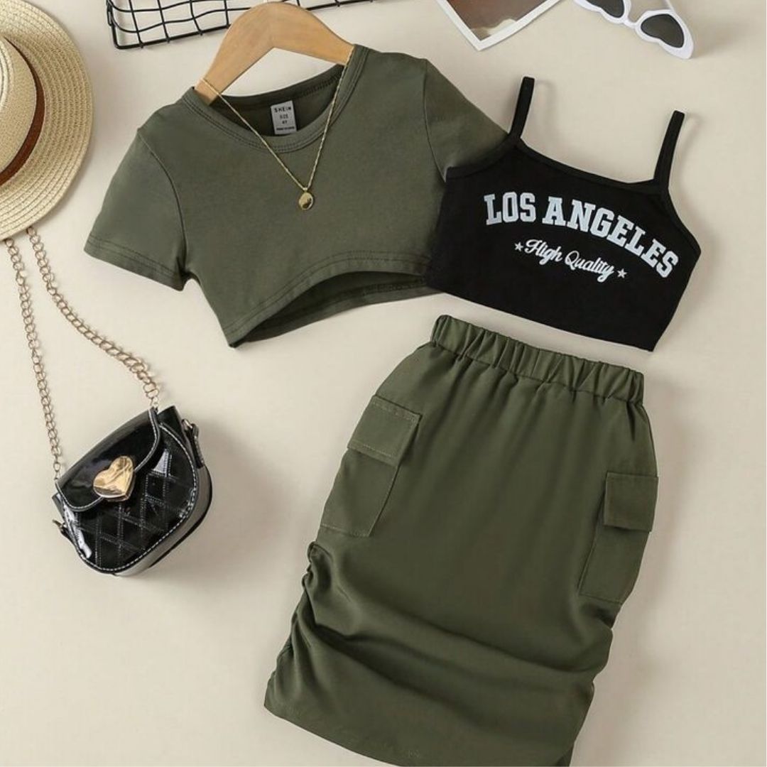 3-Piece Workout Set, Olive Green T-Shirt, Black Crop top and Shorts