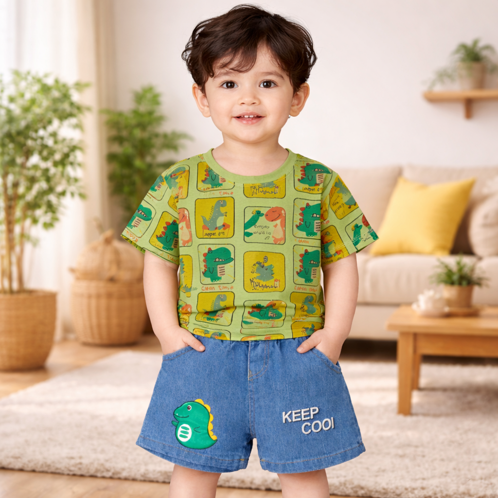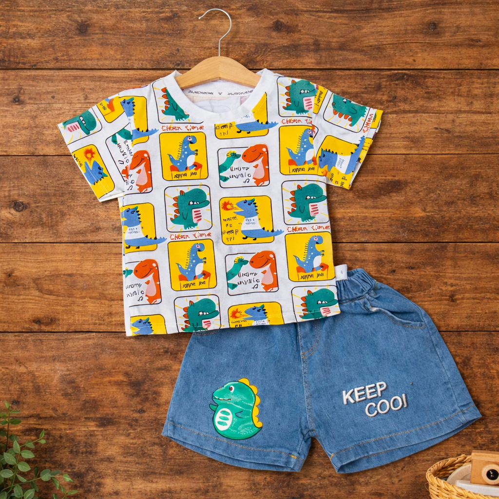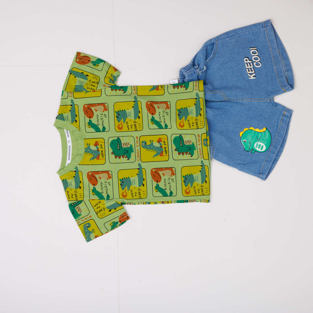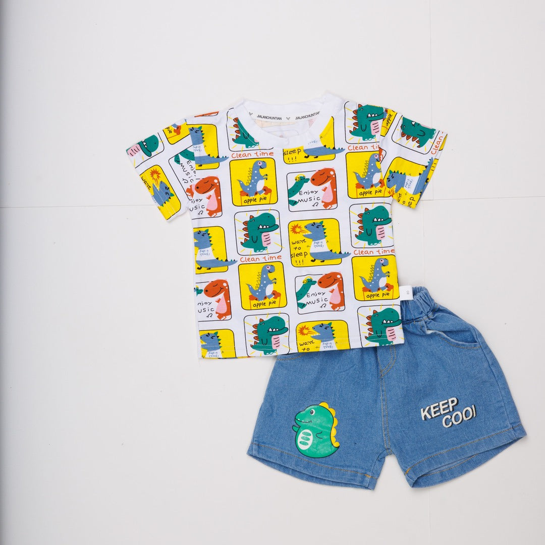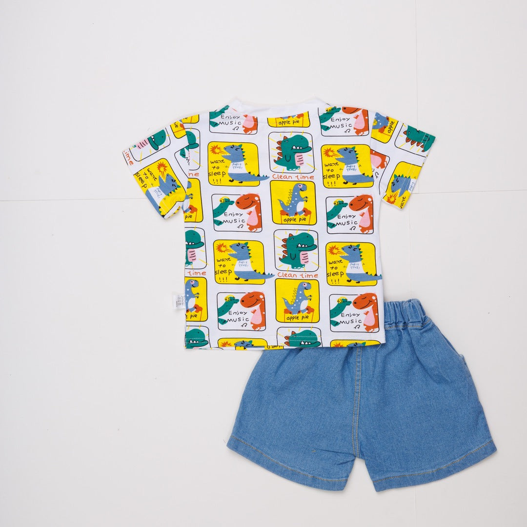 Toddler Boys Dinosaur Print T-Shirt and Denim Shorts Set, Casual Outfit