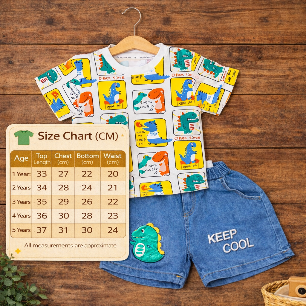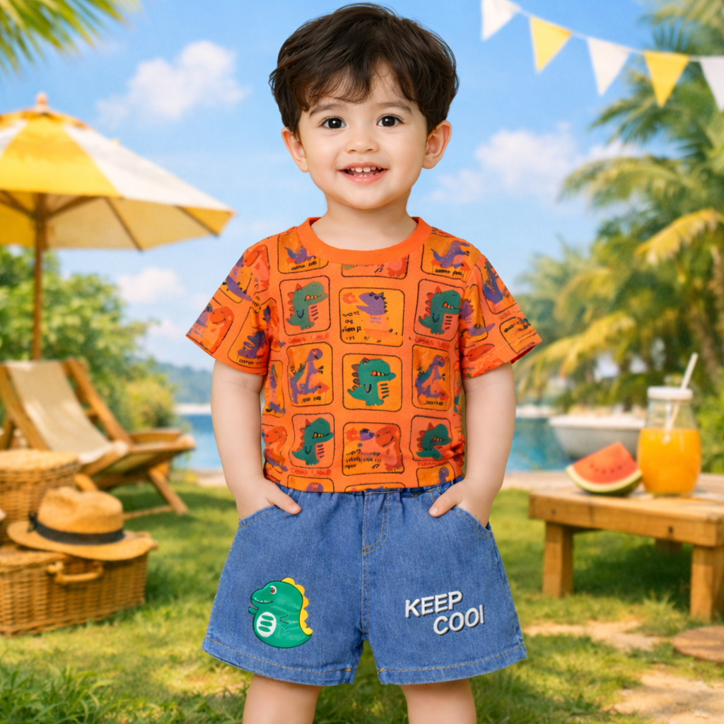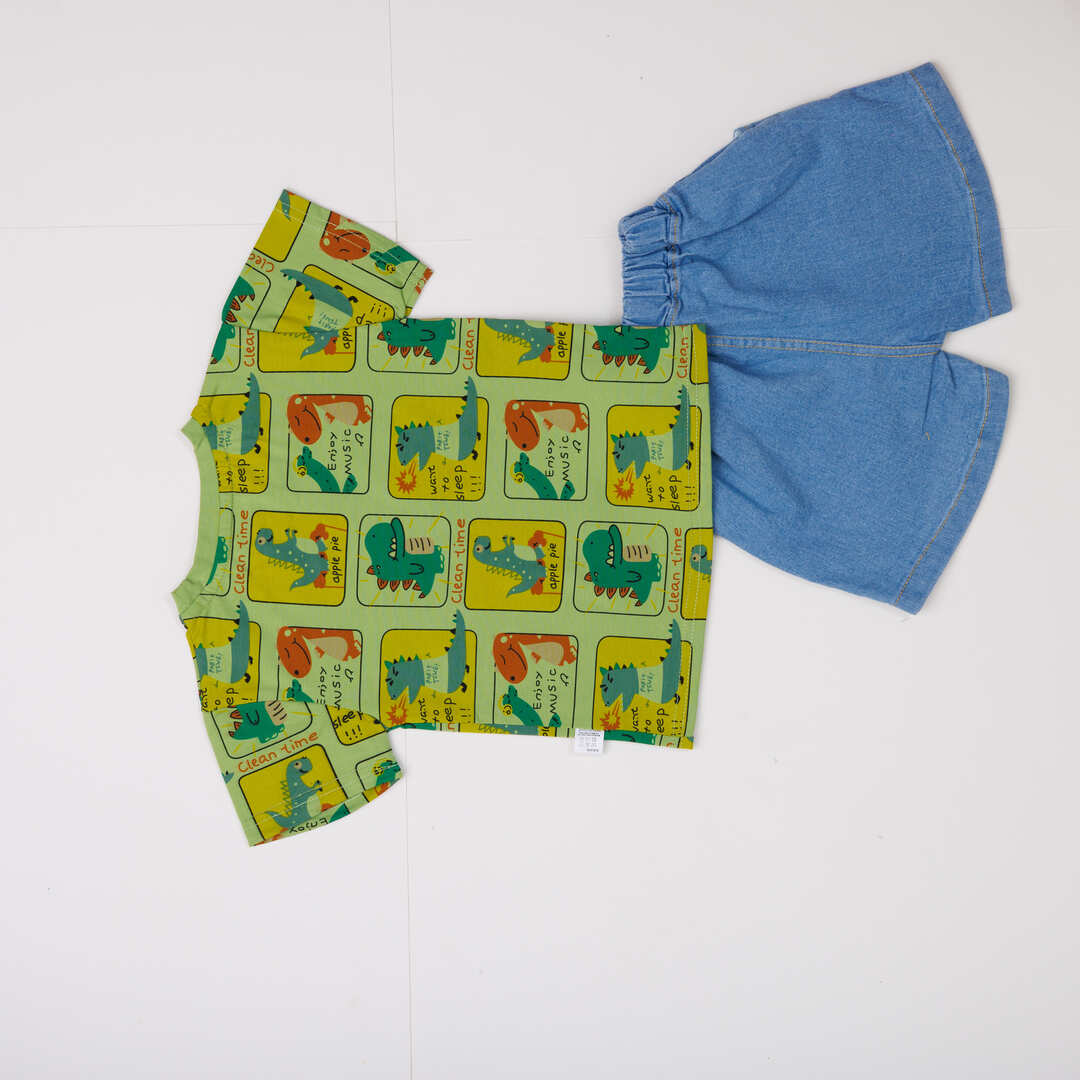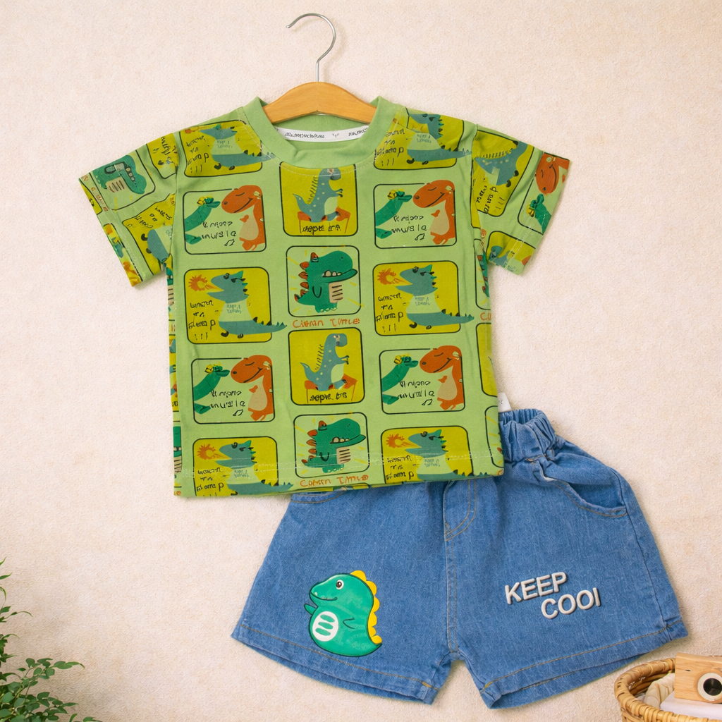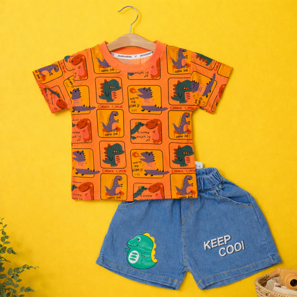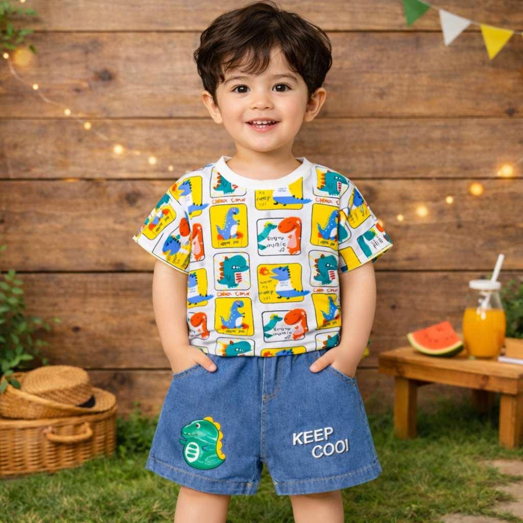 Toddler Boys Dinosaur Print T-Shirt and Denim Shorts Set, Casual Outfit