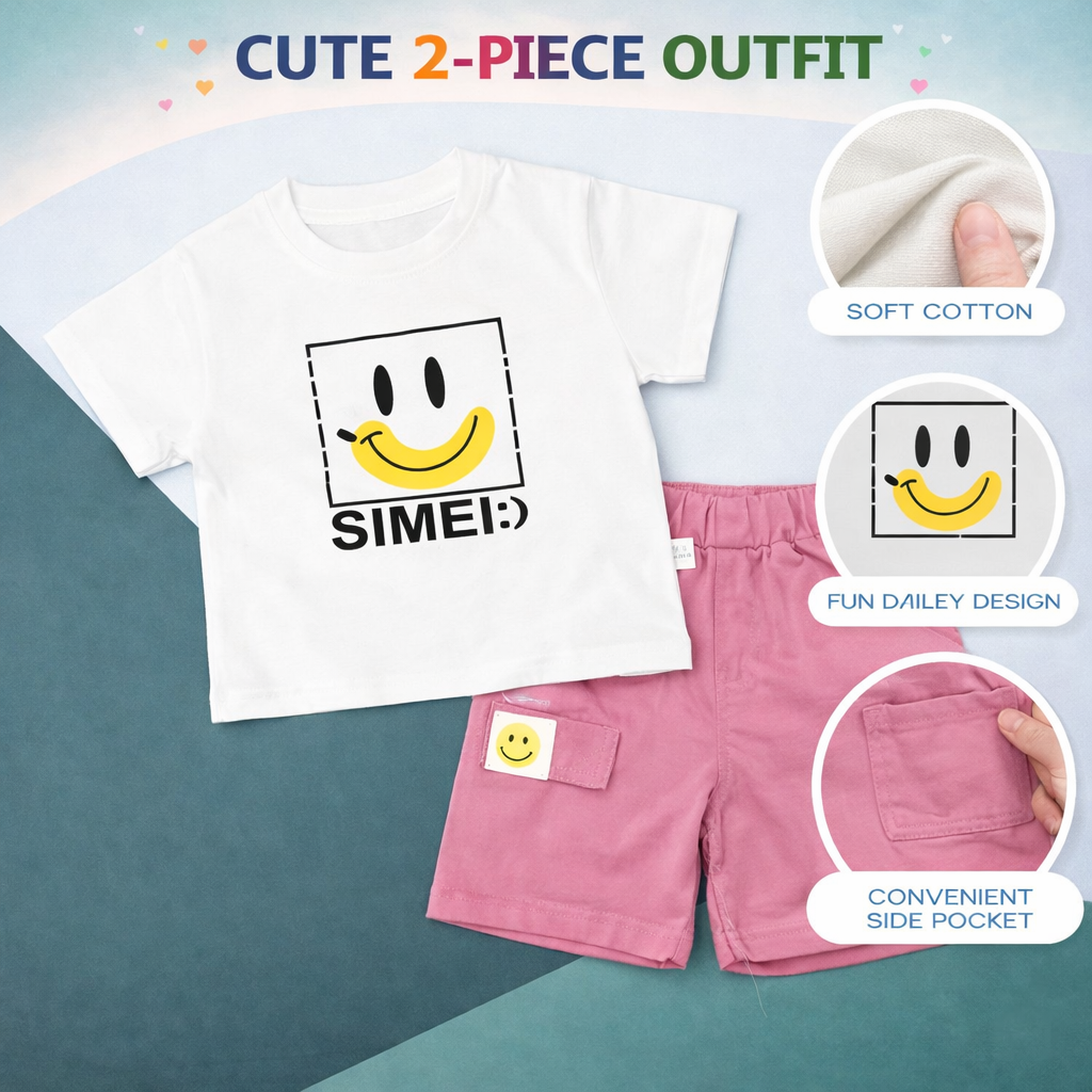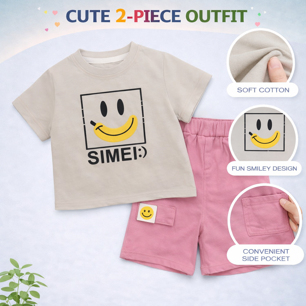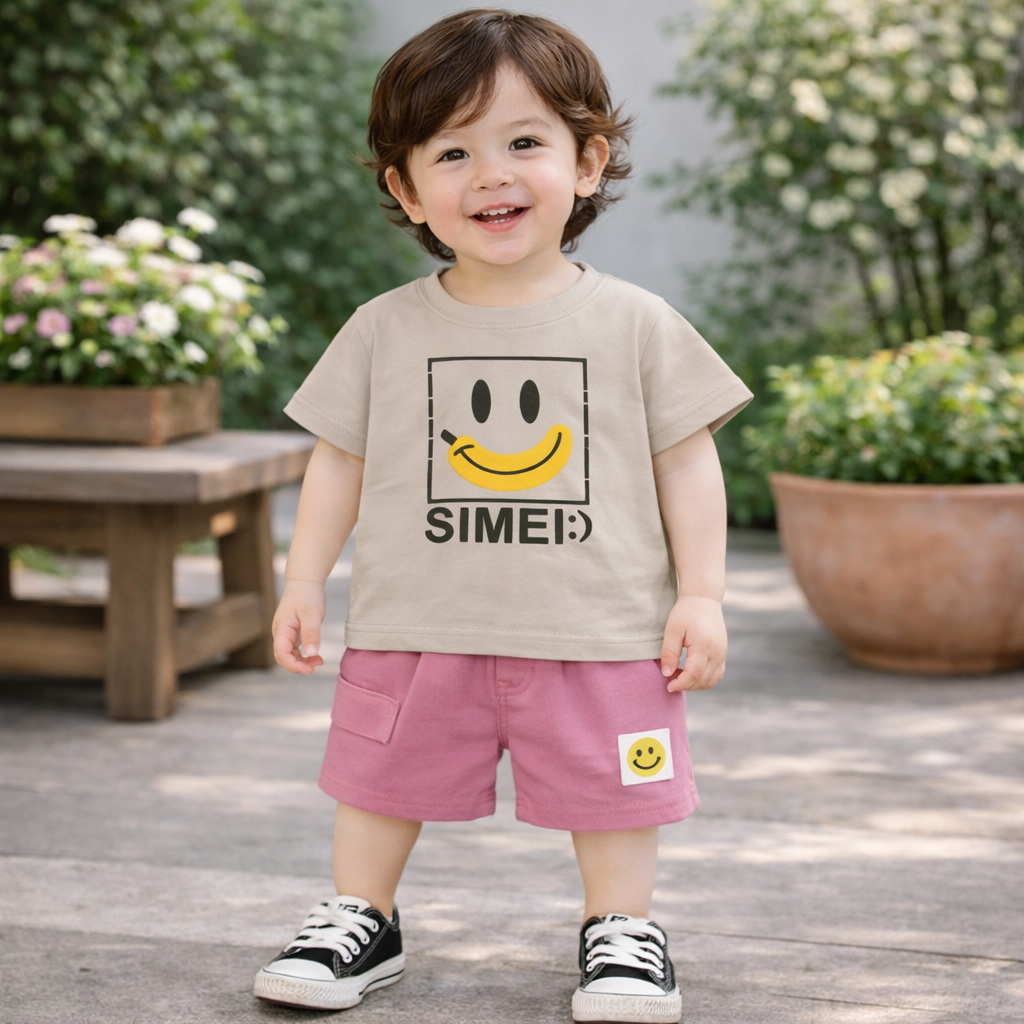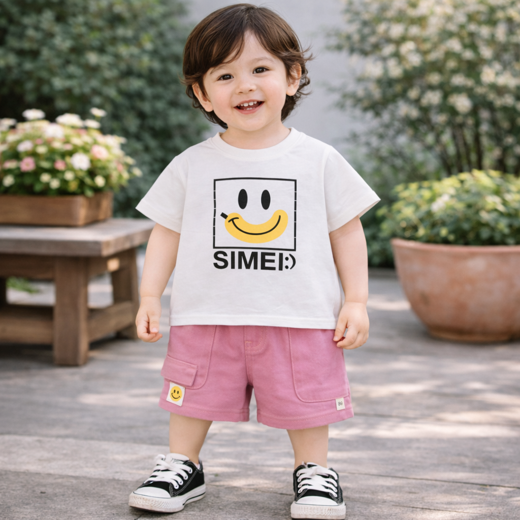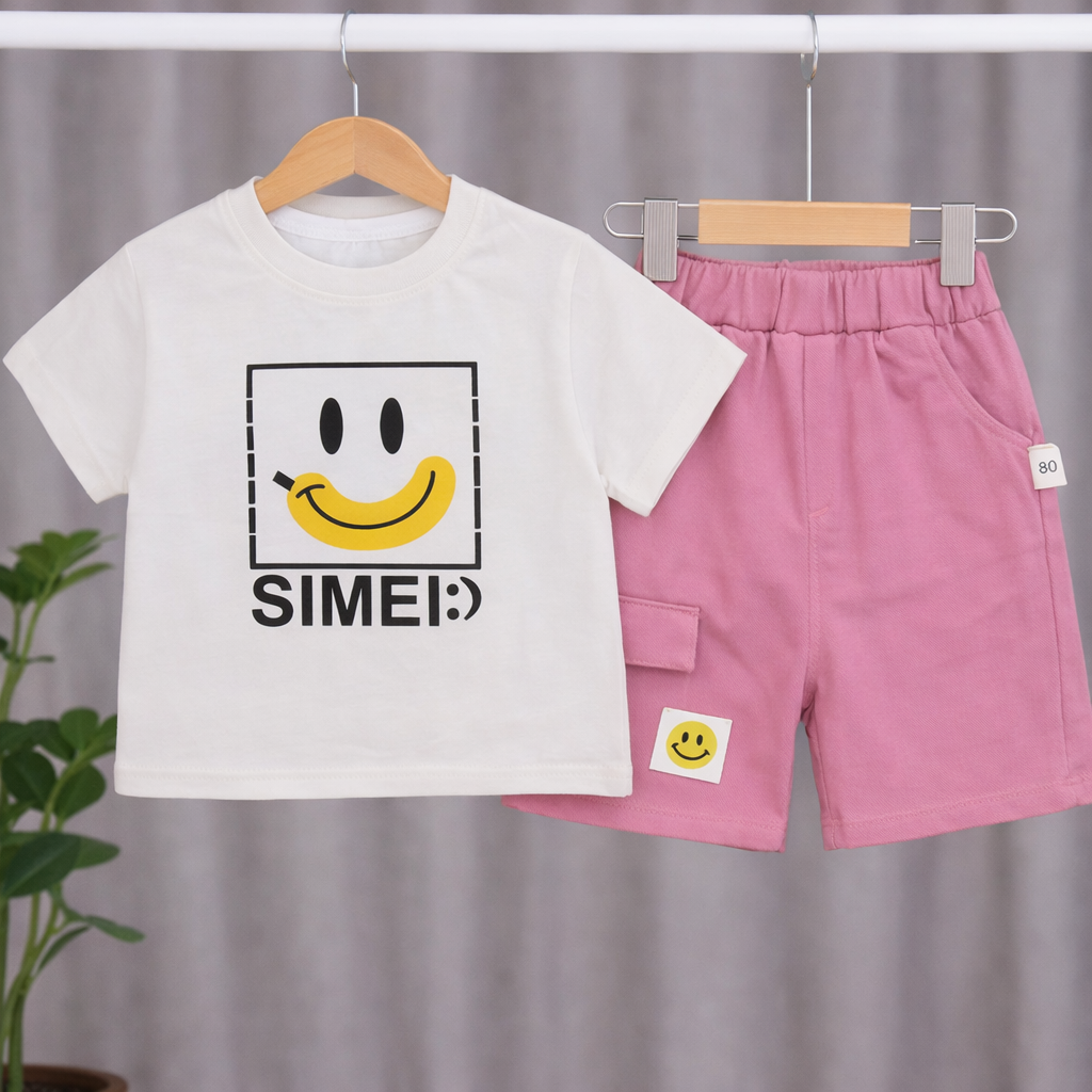 Smiley Print T-Shirt with Pink Shorts, Casual Cotton Wear