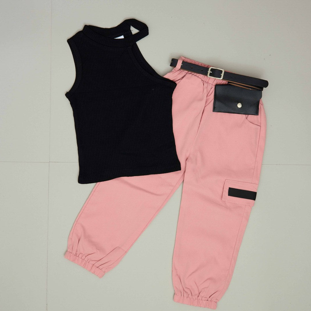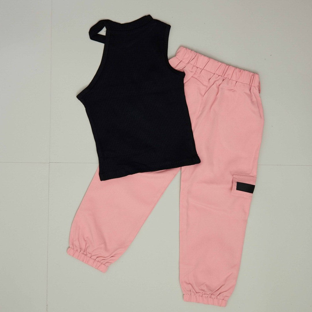 Black Crop Tank Top with Pink Cargo Jogger Pants Set, Casual 2-Piece Outfit