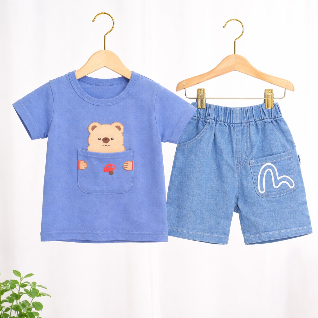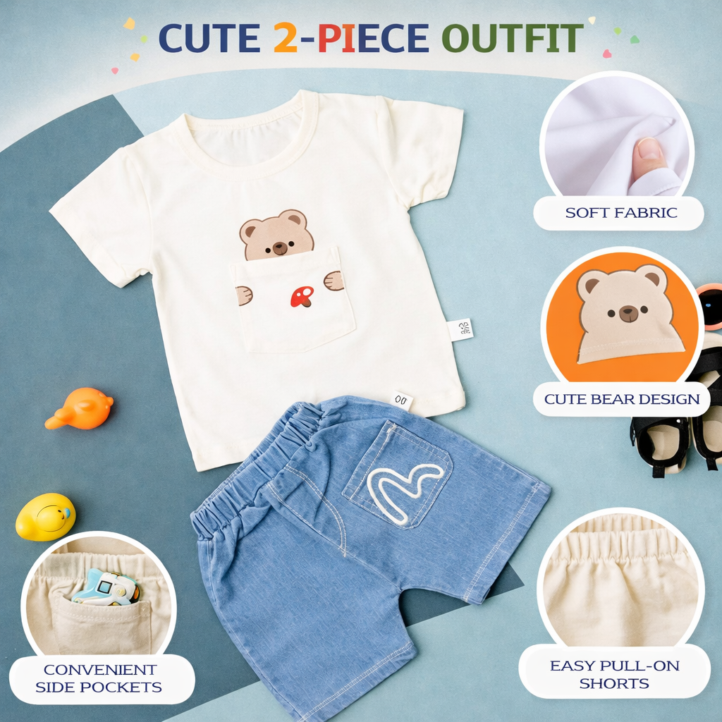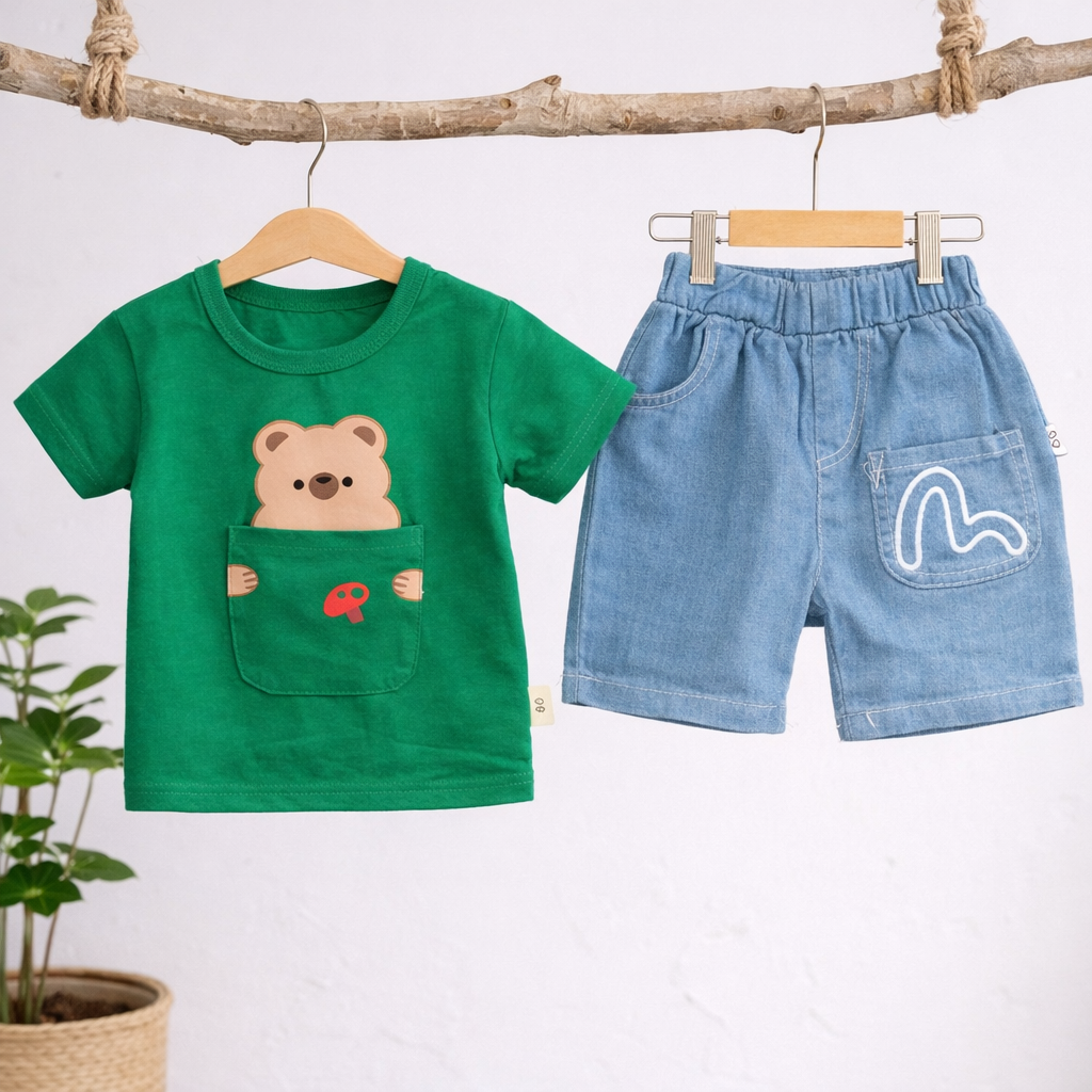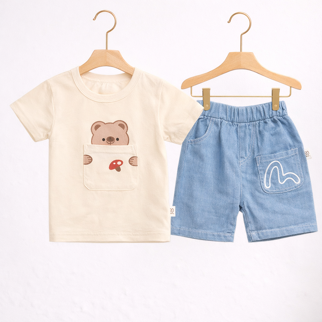 Baby Bear Print T-Shirt and Denim Shorts Set, Casual Outfit