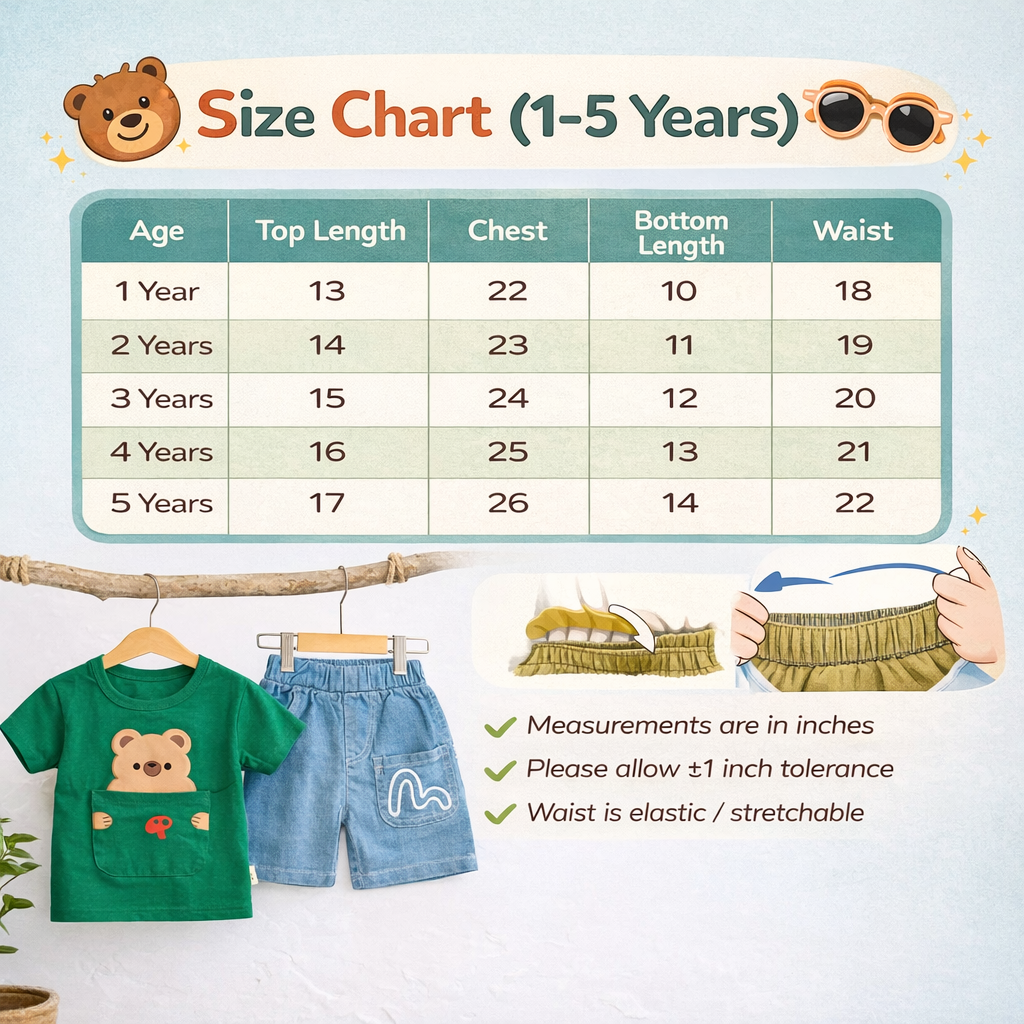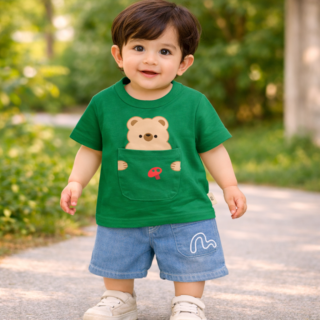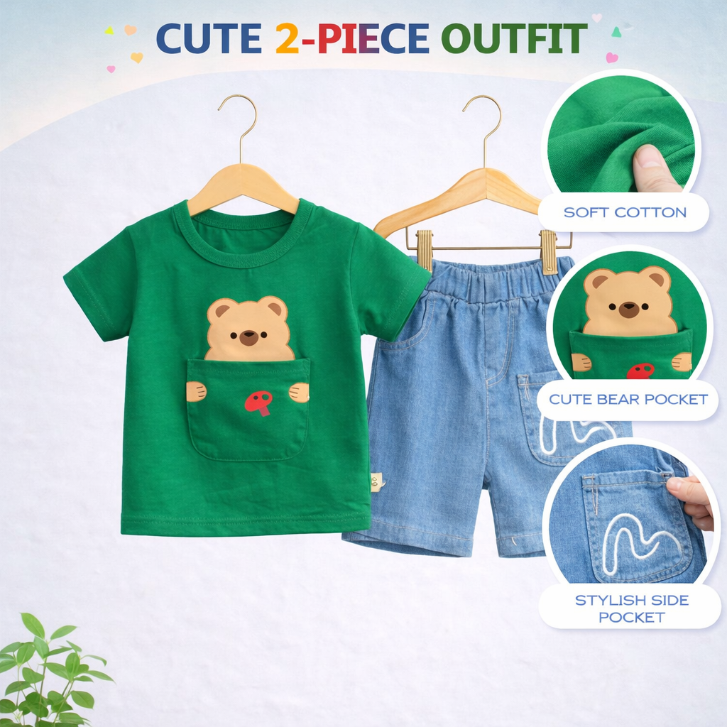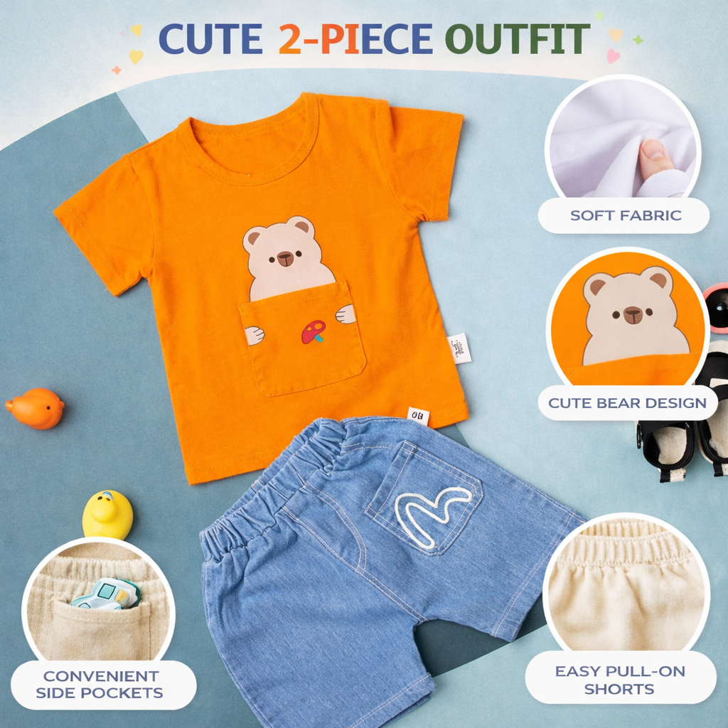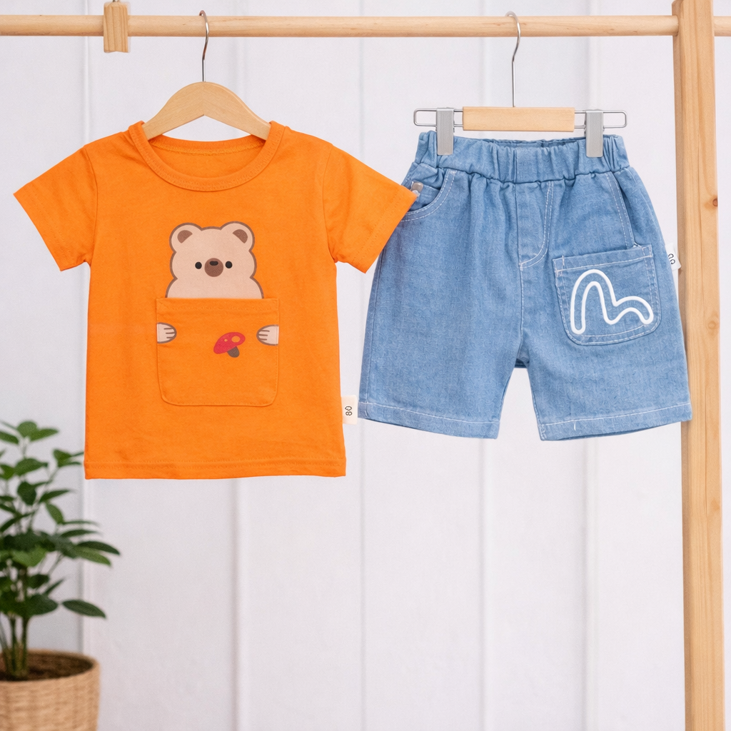 Baby Bear Print T-Shirt and Denim Shorts Set, Casual Outfit